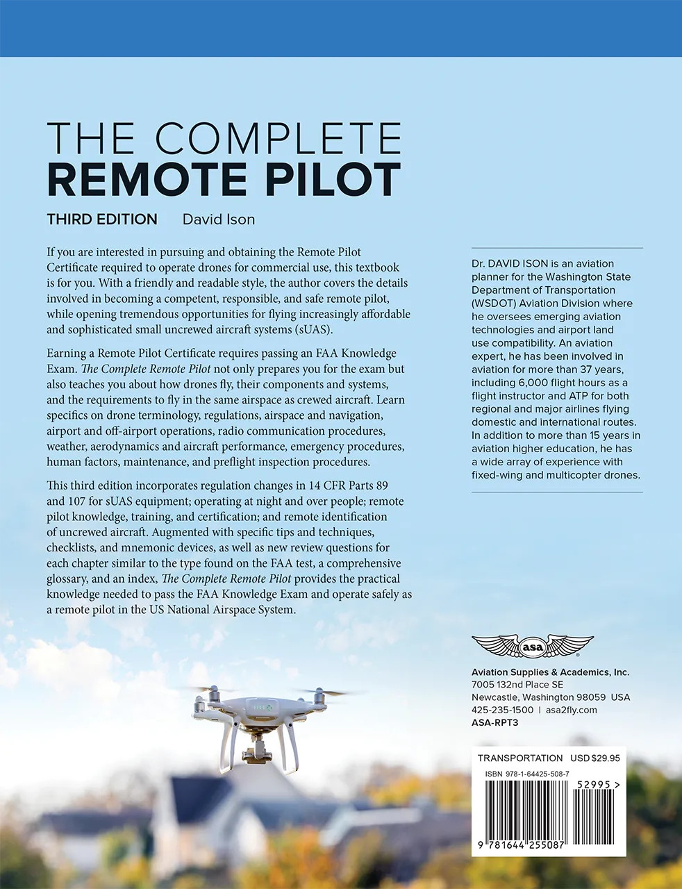 If you are interested in pursuing and obtaining the Remote Pilot Certificate required to operate drones for commercial use, this textbook is for you. With a friendly and readable style, the author covers the details involved in becoming a competent, responsible, and safe remote pilot, while opening tremendous opportunities for flying increasingly affordable and sophisticated small uncrewed aircraft systems (sUAS).