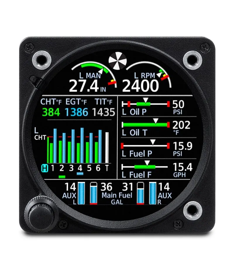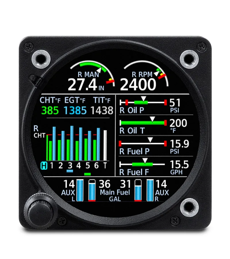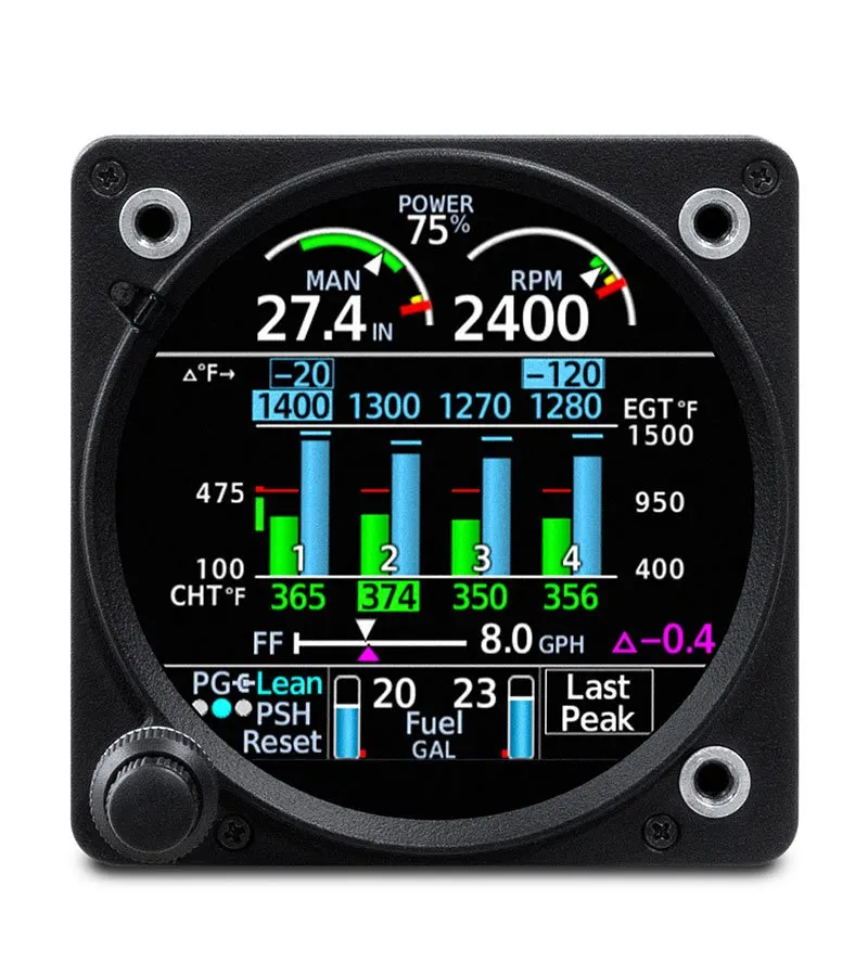 In Experimental Aircraft, GEA 24 pairs with either G3X™ or G3X Touch™ or GI 275™ flight displays to enable tailoring of instrumentation inputs for display of engine gauges, color bands, alerts, fuel, flaps, trim and other vital sensor data. Sensor kits are available for most popular engine configurations used in experimental amateur-built (EAB) aircraft, such as Lycoming, Continental, Rotax and ultralight power plants, or you can manually configure gauges with any electrically compatible sensor (see installation manual for details).
