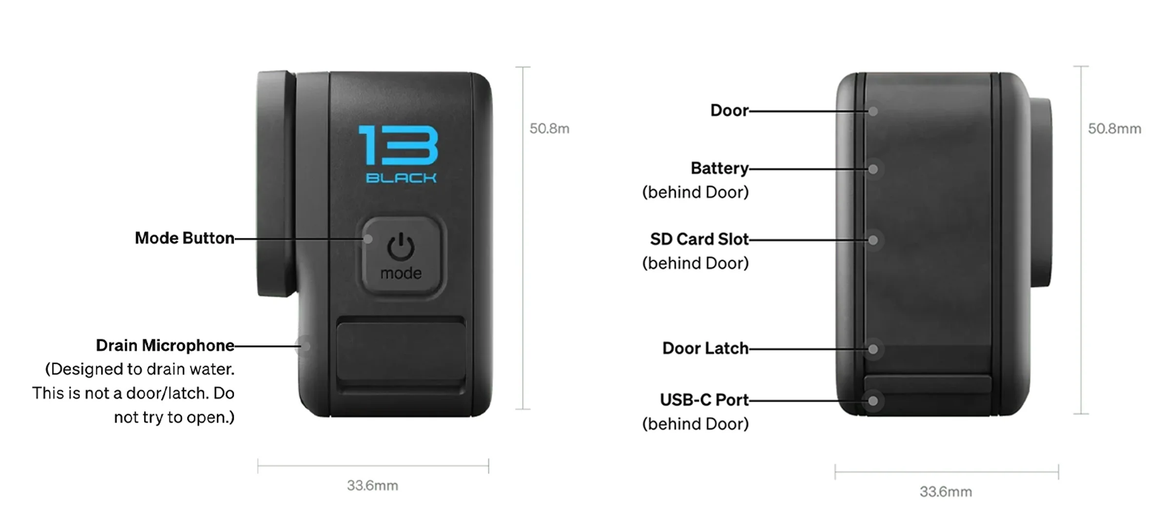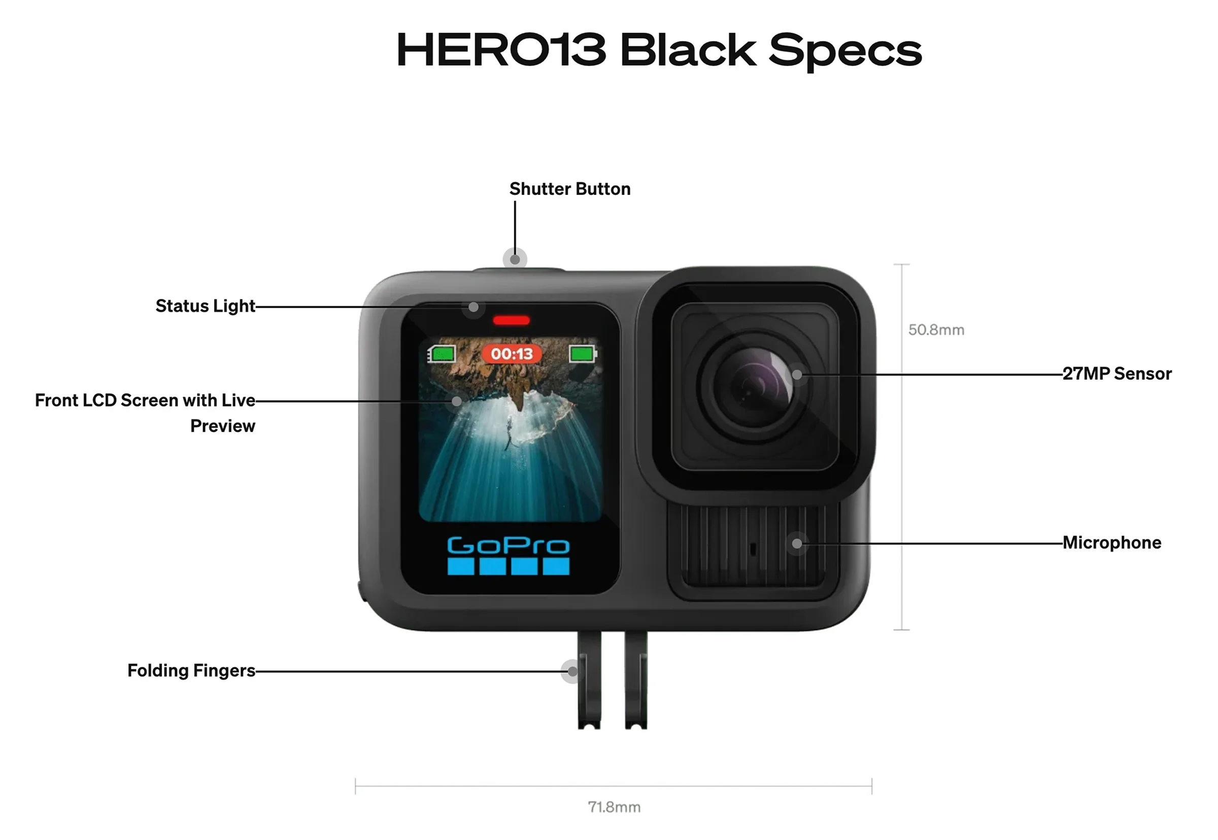 HERO13 Black boosts your creative possibilities with the HB-Series Lenses with Auto-Detect, plus compatibility with Magnetic Latch Mounting and all-new ways to extend battery power. It also features a new body design (it still fits the same HERO12 Black Protective Case and Media Mod), a new battery and battery connection points, GPS and data overlay, Burst Slo-Mo (up to 400fps at 720p), 10-bit HLG HDR, and Wi-Fi6.