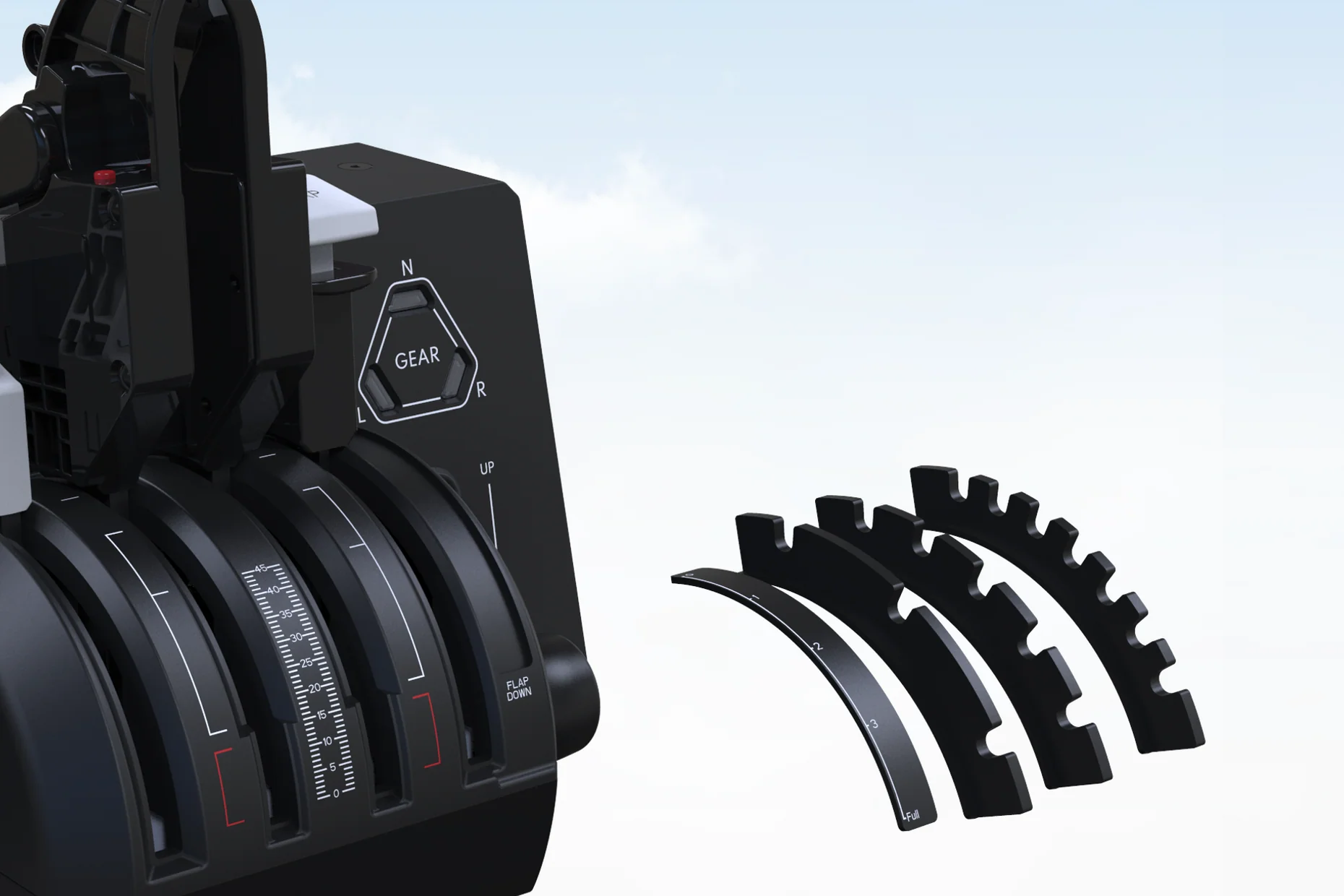 Exchangeable clip-on flap detents inlays for realistic control of various airplanes.