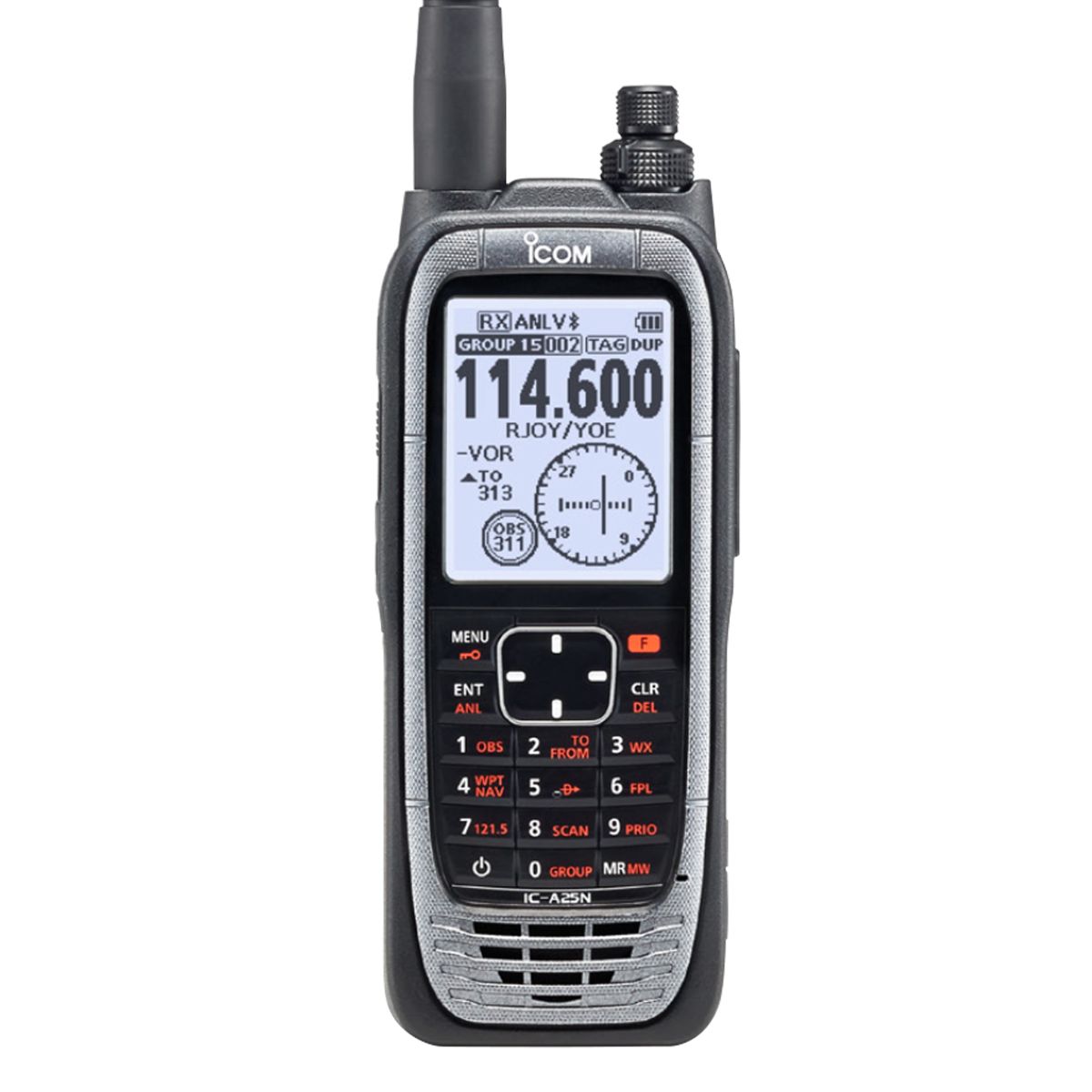 Icom's flagship aviation bluetooth handheld radio with a powerful 6W VHF air band transceiver receiver fearturing a large LCD screen, VOR and Navigation functions, IP57 waterproof construction and enough memory for hundreds of presets.