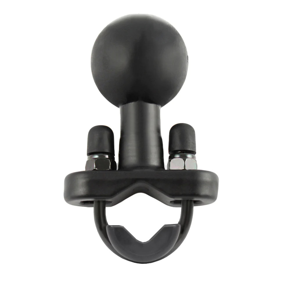 The RAM motorcycle handlebar base contains a 1.5" rubber ball designed to sit at right angles to the mounting rail. The zinc coated u-bolt accommodates rails in diameter from 0.5" to 1.25" in diameter. Included are black cover caps to be placed over the exposed ends of the u-bolt and a composite adapter that can narrow the rail to a minimum width of 0.5".