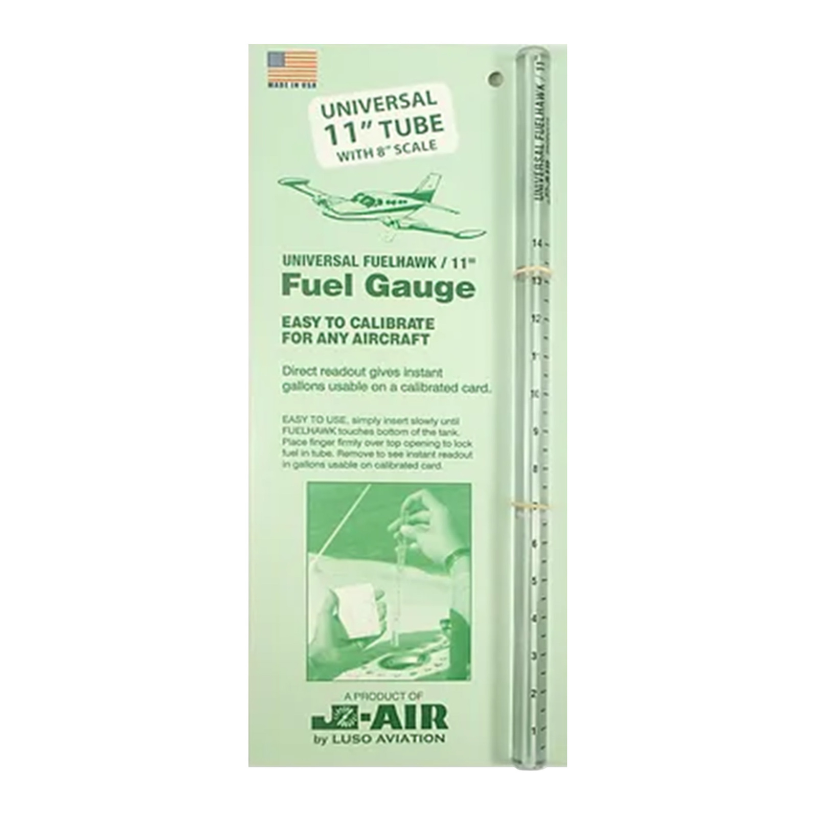 To select which length of Universal Fuelhawk is best for your aircraft, use the following guide. For example, the Universal 11" Fuelhawk has a total length of 11" but the printed scale only extends 8" up the tube. This is ideal for fuel tanks that hold less than 8" of fuel when full.